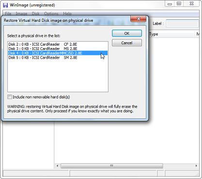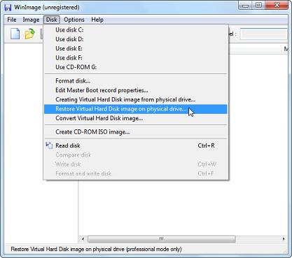 Fas clic a Disk, després prems en Restore Virtual Hard Disk image on physical drive ...